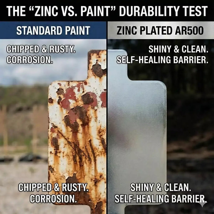Why buy steel that rusts the day you get it? Our Zinc Plated AR500 & AR400 targets feature a self-healing barrier against corrosion. They stay clean, look professional, and last significantly longer than painted targets.